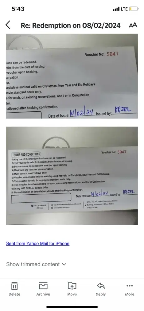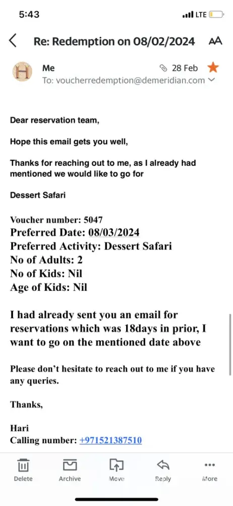 I had attached all photos of your perusal, I had already sent email for the redemption of the voucher number 5047 which was given by Hazel your sales person, it’s says that I have to book in prior of 14 days how ever I placed my booking before 18days and till now only one reply came and still not very sure weather we will be going to the Dessert Safari on the 08/03/2024.