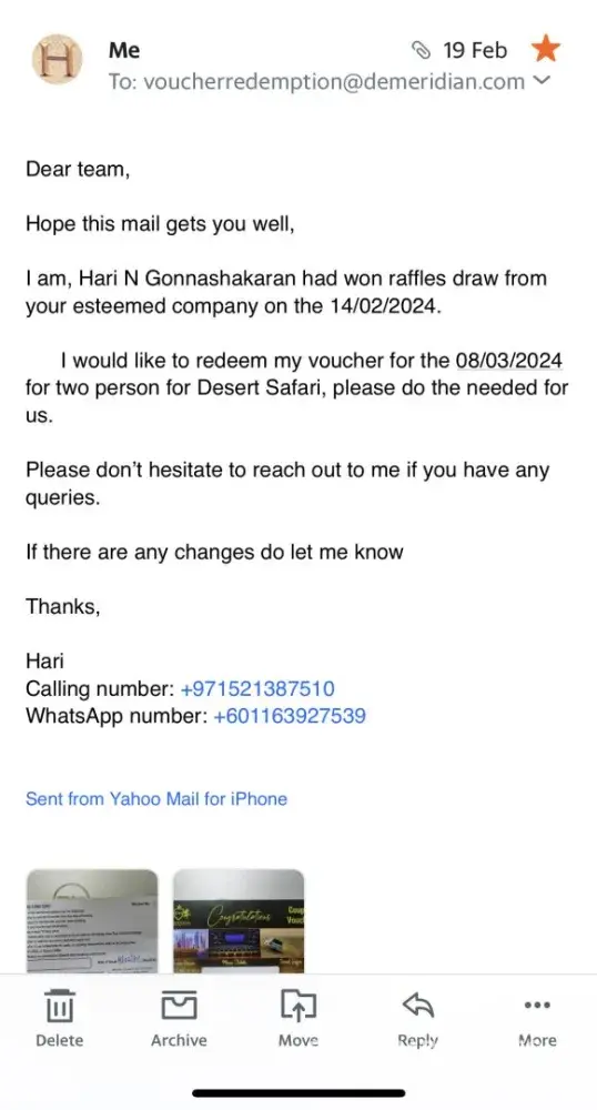De Meridian gave me a voucher for a desert safari in Dubai & an International Hotel Voucher for Couples that I requested to redeem in May 2023 But Unfortunately due to some medical issues I Postponed it to December and they Redeemed my Voucher Desert Safari Voucher on Dec 18 2023 And redeemed Couple hotel voucher on Jan 5 2024 in which me and my Husband extremely Enjoyed that desert Safari and we used hotel voucher when we took a short Vacay to Azerbaijan.