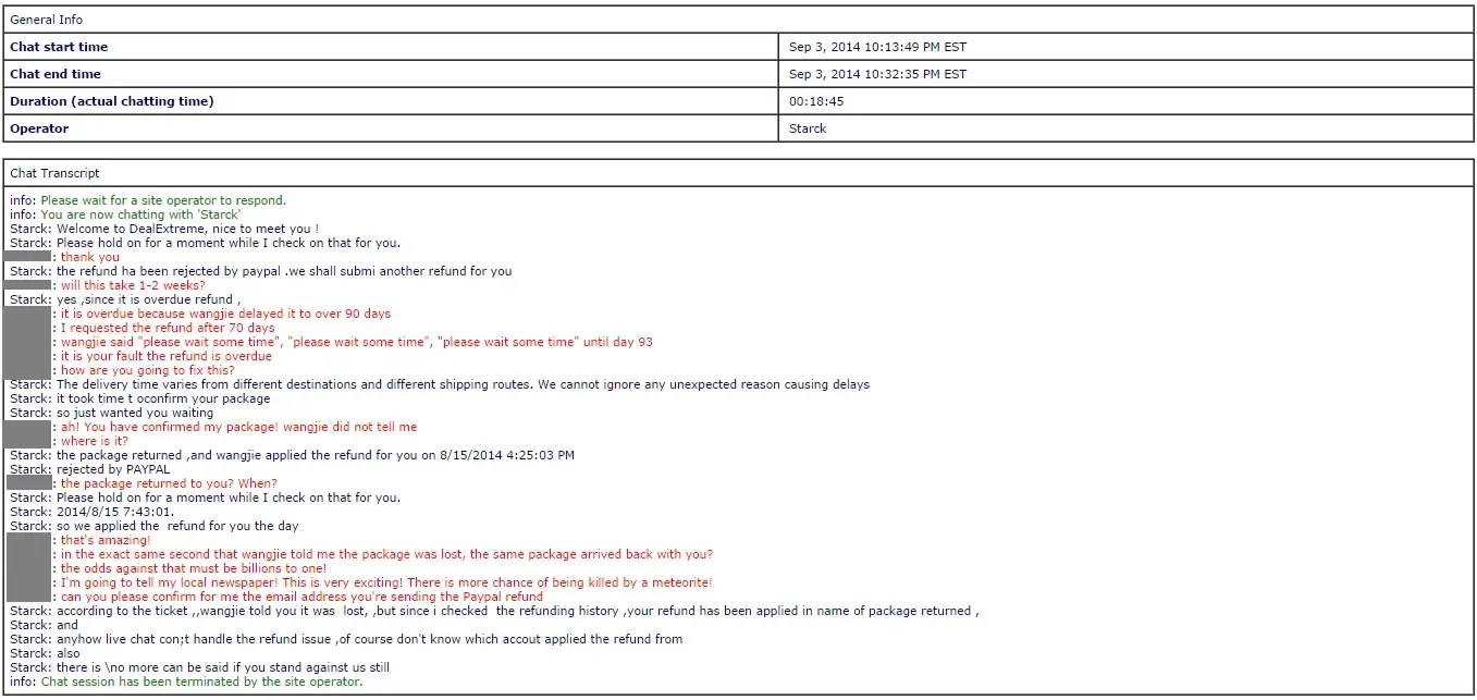 I'm on Day 112 of my (never-arrived) order. Around Day 70 I requested a Paypal refund, on Day 93 they offered me a refund and told me it would take 1-2 weeks because I had taken over 90 days(!), on Day 98 they asked me which email address I'd like my refund to be sent (!), and today I thought I'd find out why I don't have my refund. As they've closed my ticket, I've used Live Chat and been given "Starck" as an operator. I'm cutting out the part of the conversation where they told me my package had not been lost, but returned to them (as their English made the final fate of the parcel quite ambiguous).