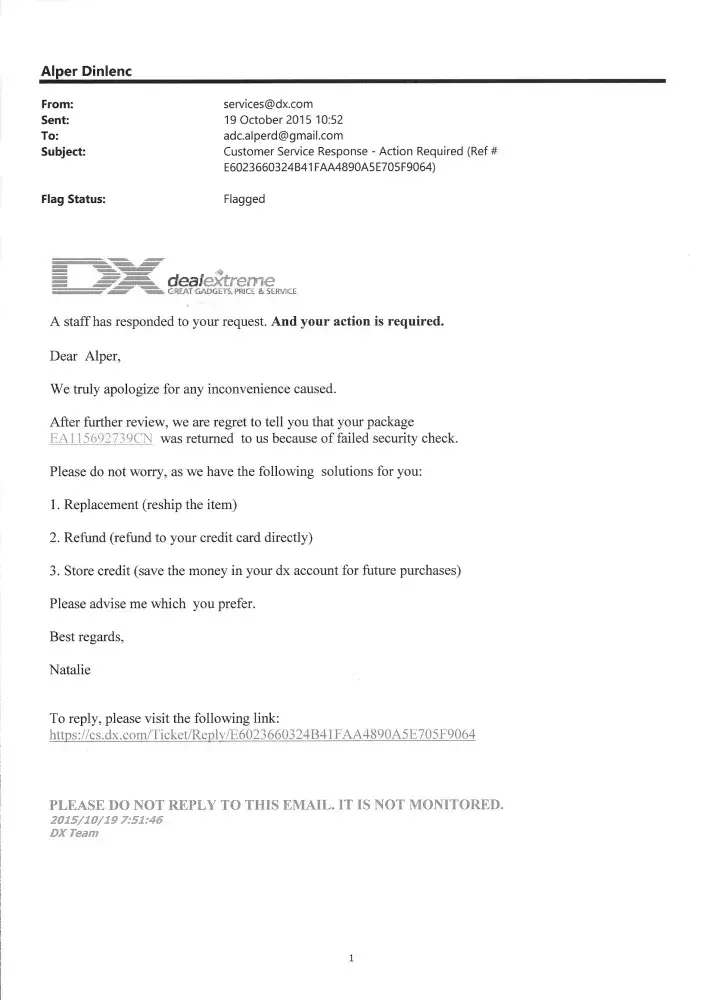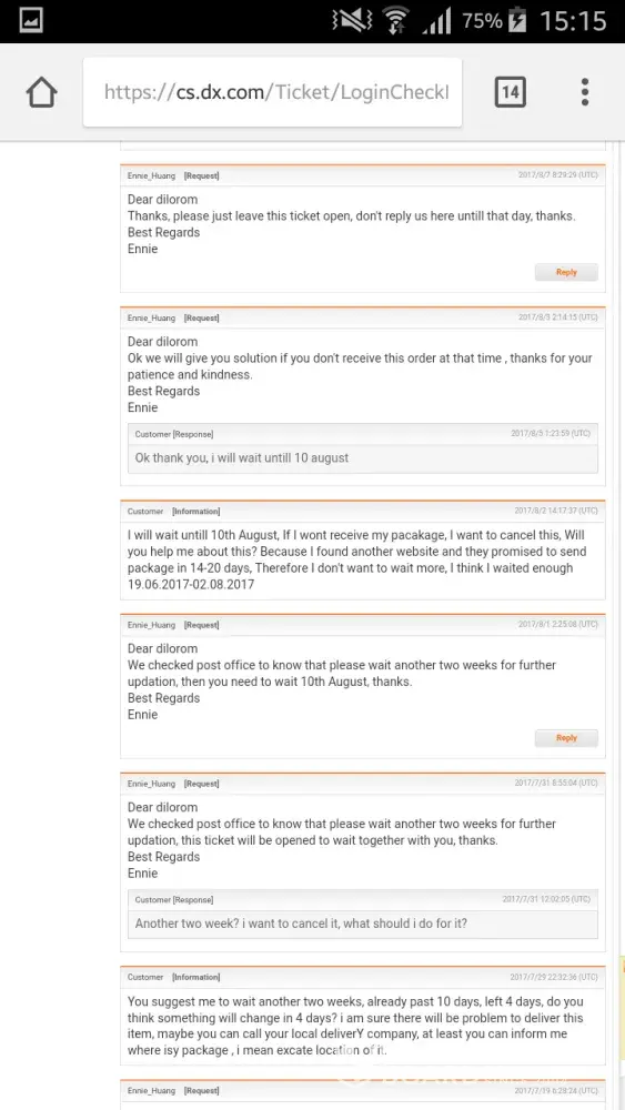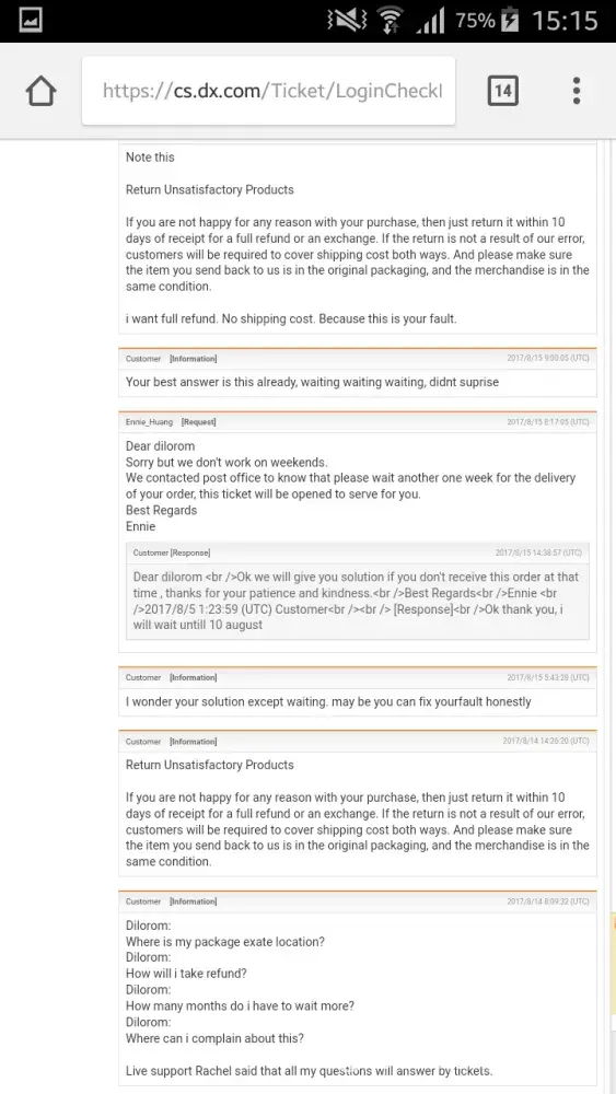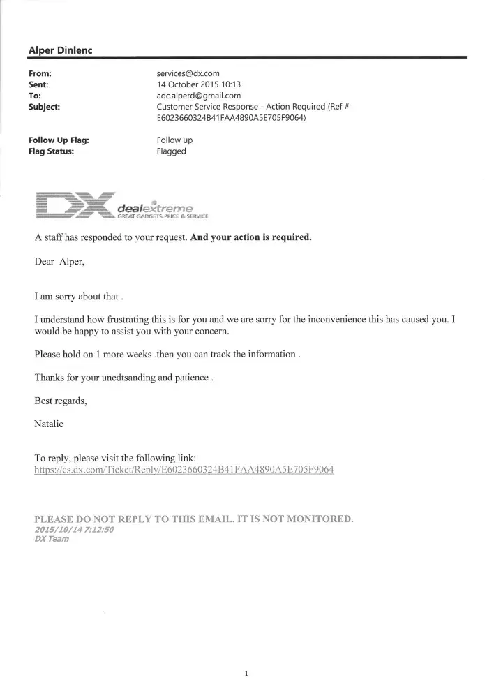I had to call my post only to find out that the product is stuck and cannot pass through because they were missing a document.- DX should have known about this. When I told them (by sending several messages and finally calling them), they sent me yet another automatic reply by saying that I should wait, for another two more weeks.