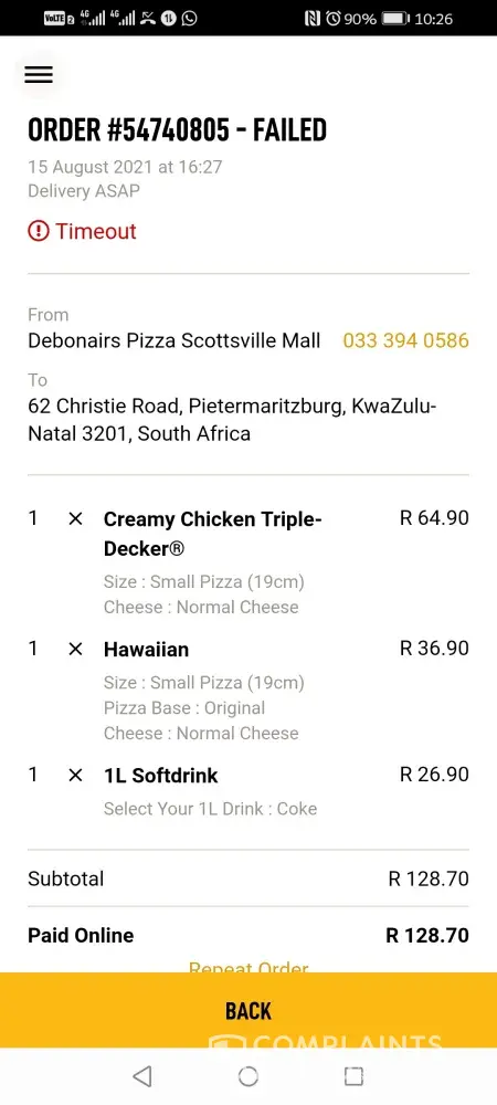 Debonairs Pizza Refund of failed order, deboanairs scottsville in Pietermaritzburg, kwazulu natal.