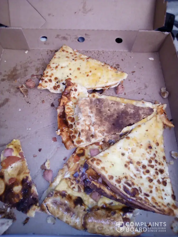 Ordered pizza telephonically today the 12th of February. The pizza arrived well on time. Mind you this was NOT the first time they serve me such. Thought I should give them the benefit of the doubt but today they took it too far. The Pizza I ordered had NO filling at all. The entire pizza was burnt. The base was beyond burnt. Even the cheese griller was burnt. i could count the pieces of ham. not more than 10 in the entire pizza. the pizza collapsed. I had to throw away the rest of the pizza. My R200 down the drain just like that. Don't know how they could serve me such. I want my money back asap. I will never order again