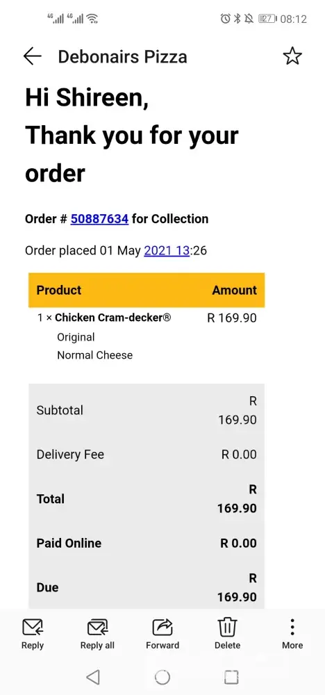 Orders a pizza online thinking OK I can just go pick it up and as I'm running late already for a 21st got at promande debonair I paid few minutes later they give my order from there I go shopping further I don't check thinking it the right pizza I get at home past 4 still don't check coz getting done to leave for the 21st get back home past 12 going to eat now open the pizza take a slice an saw but this is wrong what cud I do but eat it this is the 4th time I must change pizzas coz ur stuff don't check the slip on what I have order
