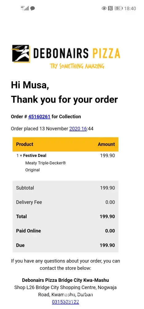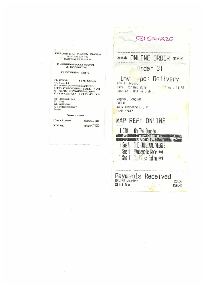 My name is Musa Ncala, I placed an order with debonairs in bridge city mall, time 16:44 order number ‪[protected]‬