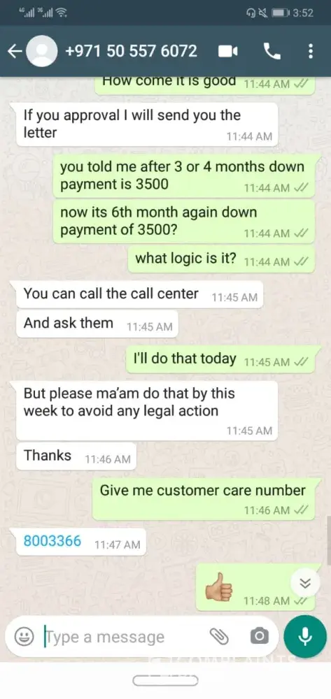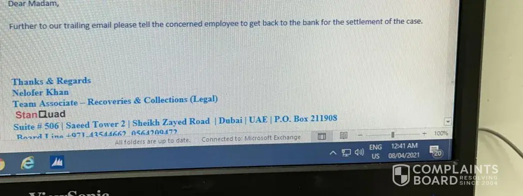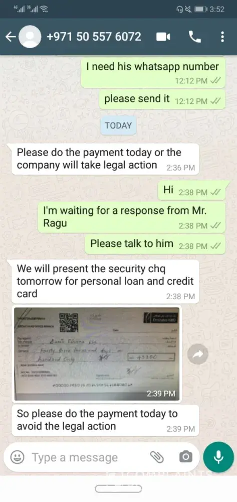 He started the conversation by agreeing to a settlement pay but never gave me a settlement letter, I cannot pay 1000 AED every month without a proper settlement plan or guidance, hence, I wrote an email, however, nobody contacted me for the same. Mr. Amjed keeps threatening me every month saying he will submit my cheque against both loan & credit if I do not make the payment. With all due respect, I'm not a defaulter with your loan & credit card all I started paying with an intention of closing it and by trusting his words. However, every month I'm being a victim of his threats (please check my screenshot) even today he did the same. I asked for the settlement plan, he sent a screenshot of my cheque to be submitted.