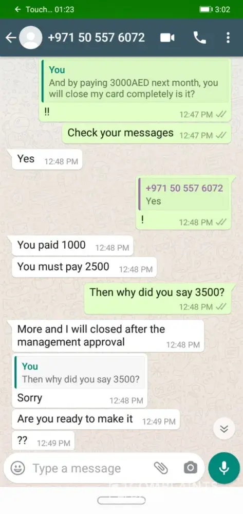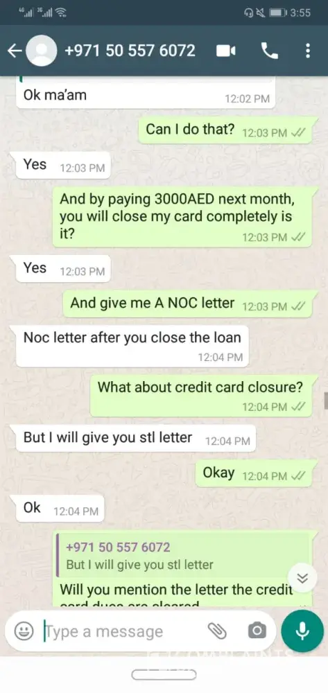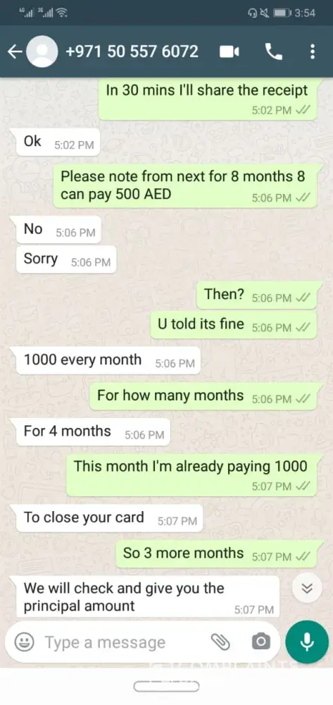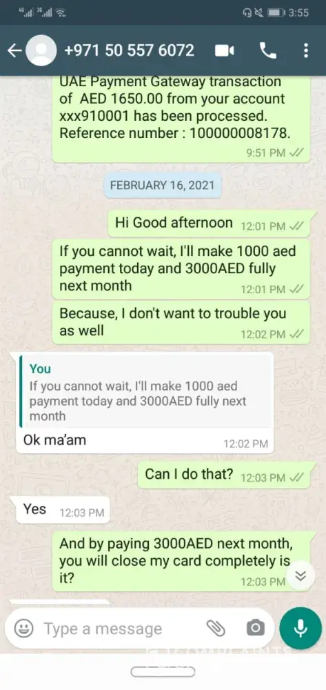 This is my 4th email regarding my credit card settlement and It is also a complaint on the collections agent who contacts me. I have a loan that I have never missed paying in these 1.4 years even when I was paid 50%, I ensured my loan amount was paid. Also, It has been 7-8 months since I had been using a credit card with deem and in November 2020, Mr. Amjed (+971 50 557 6072)contacted me for the credit card & he agreed to give me a plan if I pay 1000 AED for 4 months, last month was my 5th month and due to continued covid situation I couldn't arrange the 3500 AED, hence I asked him If I can pay 1000 AED this month & 2500 next month since He had agreed I made the payment and now this month again he is asking me to pay 3500 AED. Though I requested if I can clear it in 2 installments he was not ready to offer me a proper plan nor a letter.