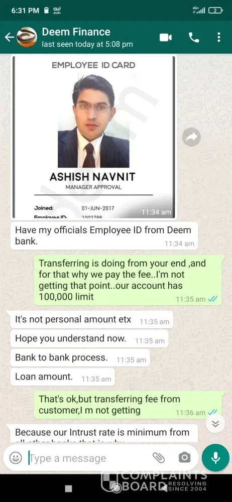 My name is James. 2 days before I saw in facebook for personal loan in deem finance and I shared my number. Then one person His Name Ashish Navnit contacted and given the details for loan. For the statement purpose he told to deposit 2000 dhs and as transfer loan charge 2300 and insurance agreement 1650 we paid..