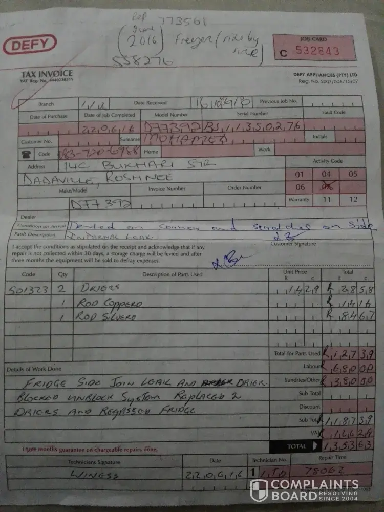 Defy collected it, fixed it and returned the freezer to me and charged me R1353, 63.