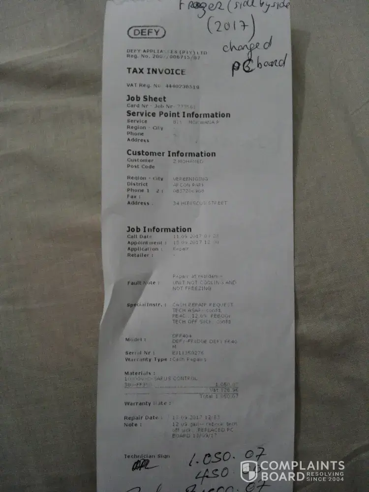 An agent came to my house and after inspecting the freezer said that my PC board needs to be replaced. I paid him R1500, 00 for service and a new PC board. (Ref: 773561)