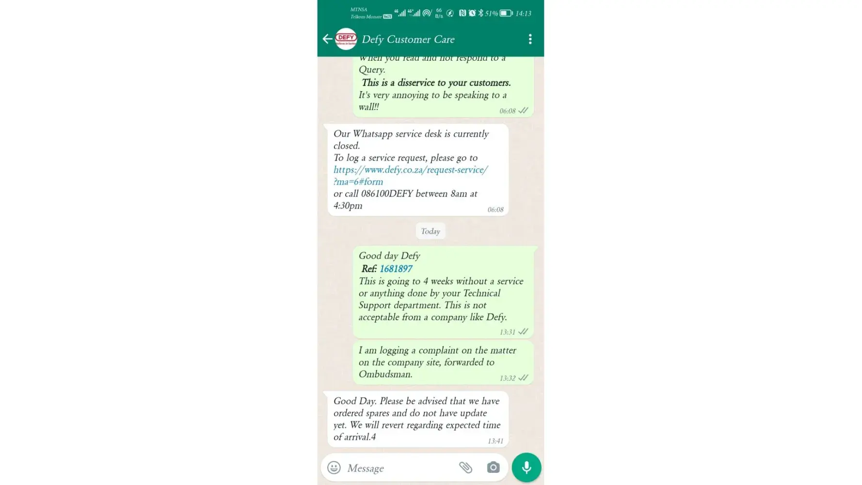 Today when called again, they were offline,, logged message on their what'sapp service line and this was the response.