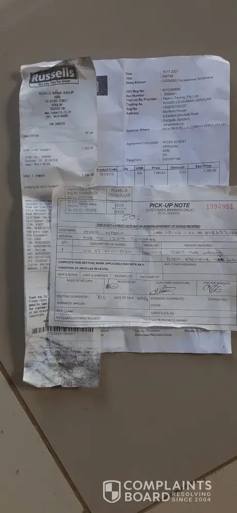I've bought a mini oven stove from the 16 November 2021, and due to faulty elements i had to return back to the store in verulam, Russells, till today i don't have oven, now i feel like my rights has been violeted, i need my stove or be refunded so that I'll be able to go and buy its somewhere coz yiu guys you have failed me.