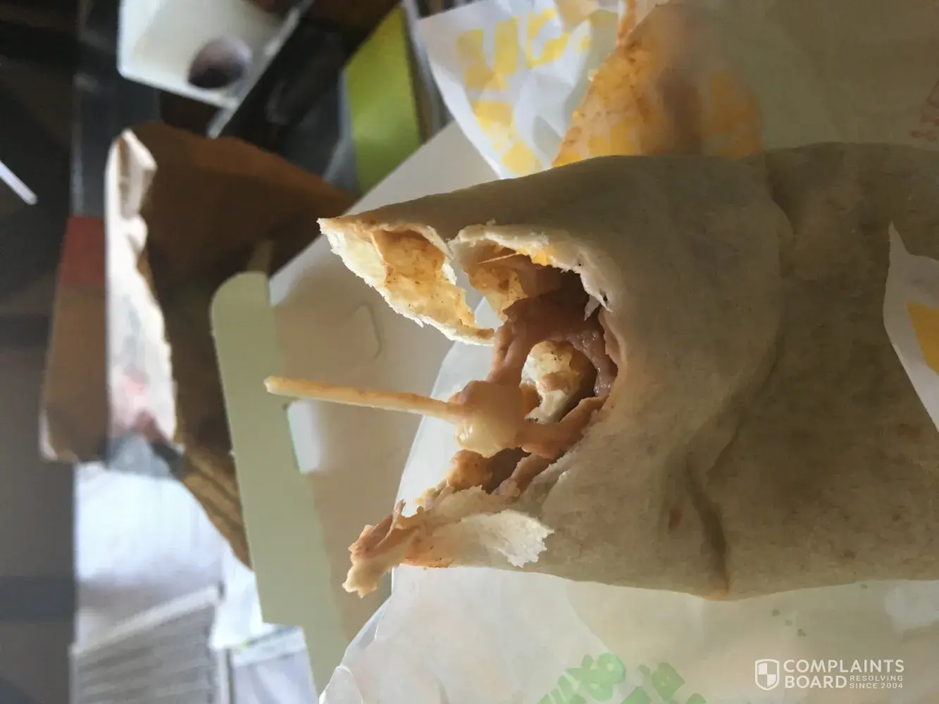 I bit into the burrito and there was a piece of wire plastic inside the burrito, was pretty shocked. This is the del taco near my house and one that I've been going to for some time now and I have never had any kind of issues with them until now, this is actually really hazerdous and if it was a child that bit into this it could of been a lot worse.