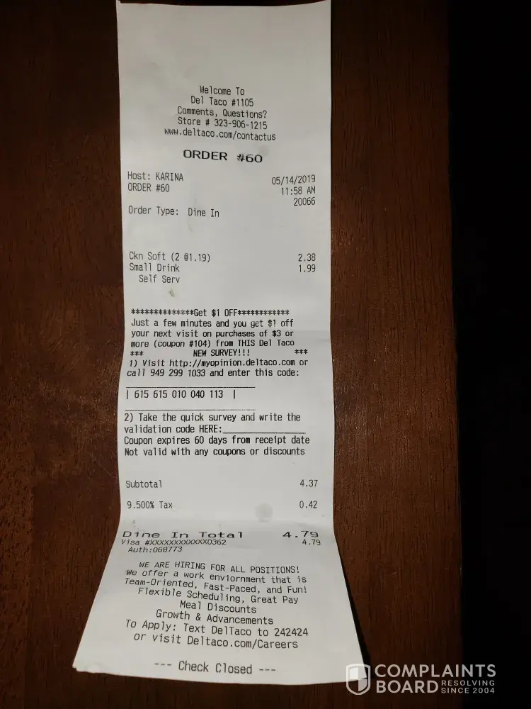 Visited Del Taco on Bobier in Vista, CA on 5/20/19 at 8:45 AM.