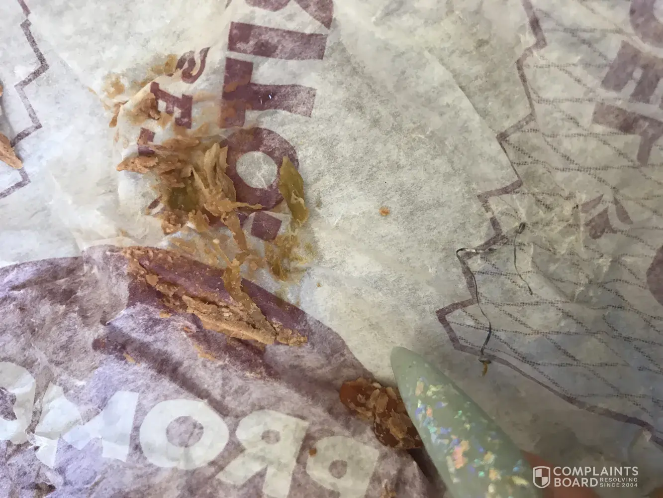 I was eating my burrito when something sharp stabbed me in the cheek. There was a long piece of metal in my burrito possibly from a grill brush! I am very upset about this and hope it doesn't happen to anyone else. Metal grill brushes are very dangerous as the pieces and break off and become embedded in ones throats which is very uncomfortable and hard to remove. I am very disappointed in Del Taco that the grill wasn't at least wiped down after being scrubbed. This could have been easily avoided.