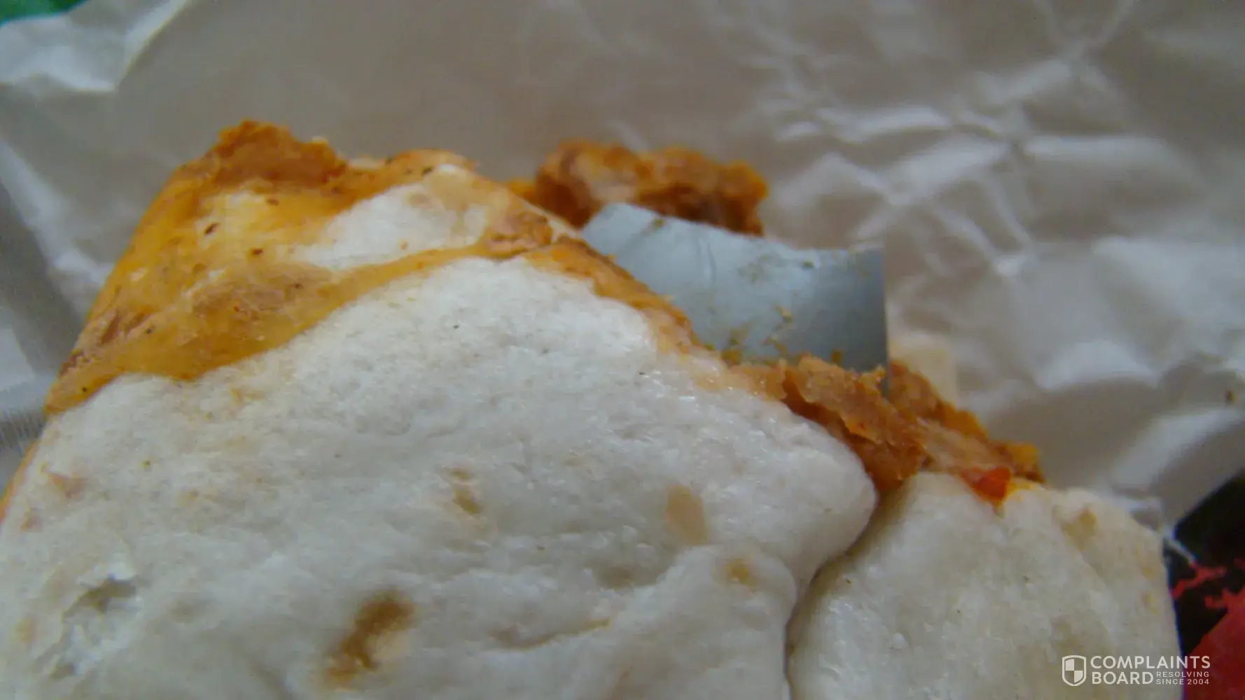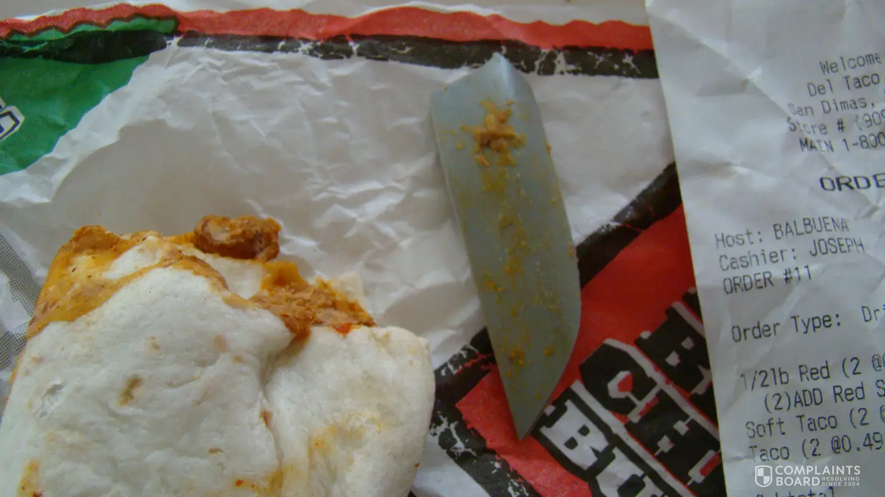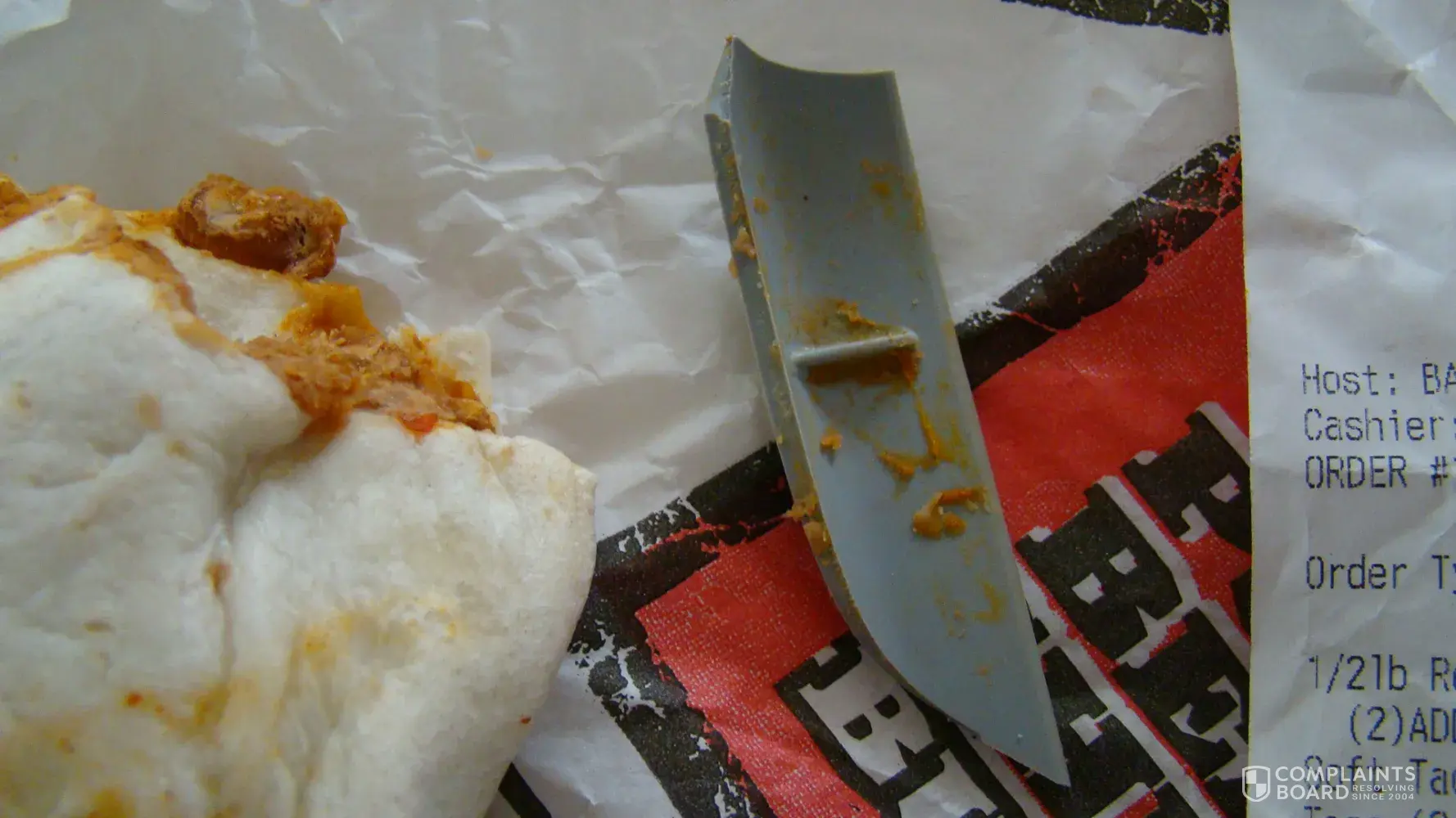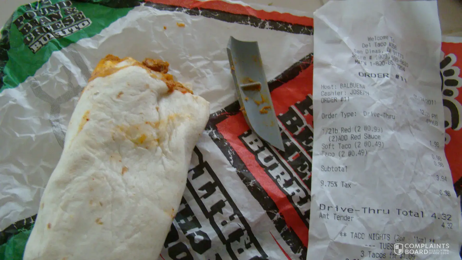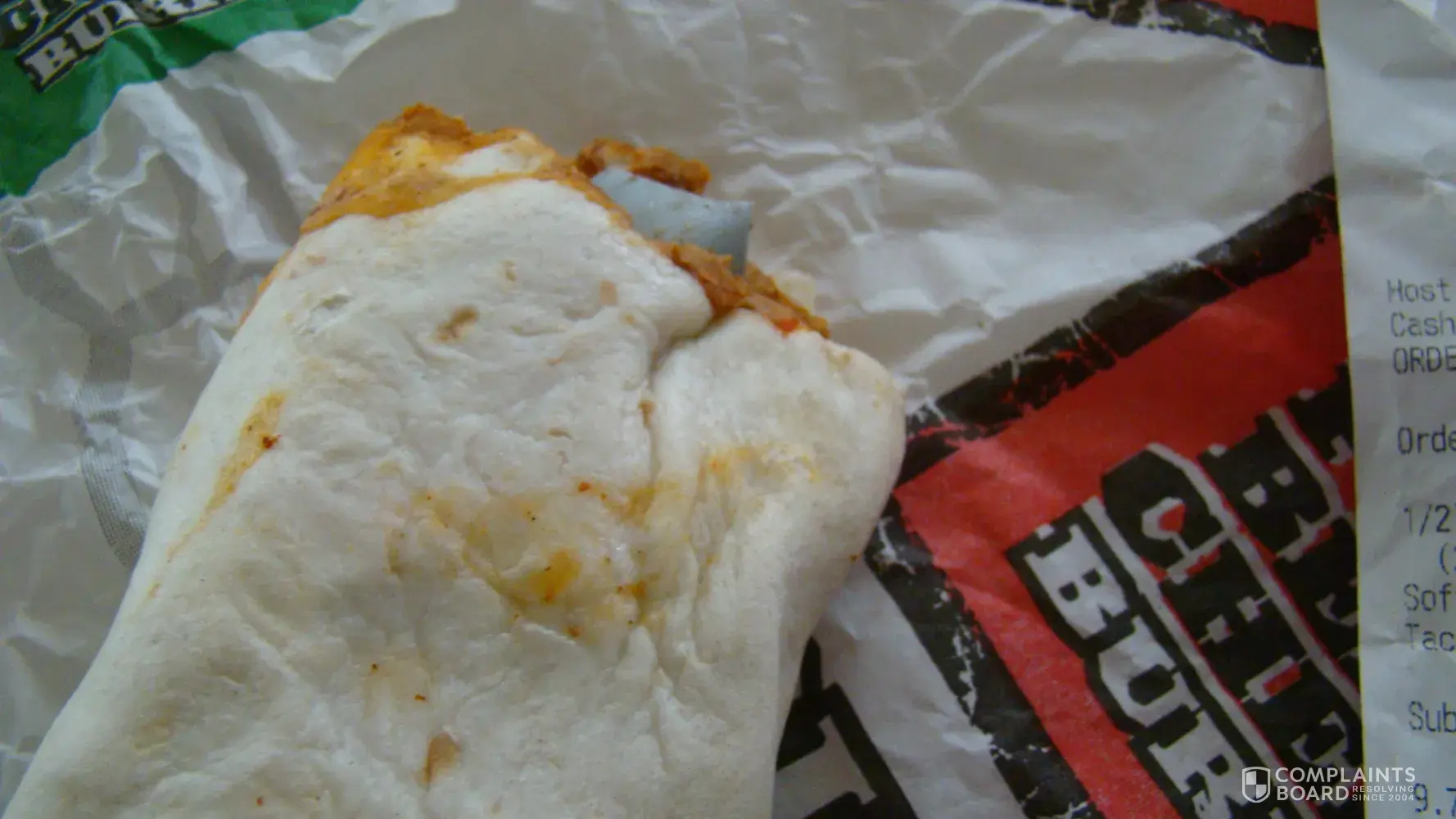 Please see these pictures attached. I had a bean and cheese burrito, bit into it and cut the roof of my mouth on this. I called and they said they would replace it. That was not good enough. They should be able to see something this big when smearing the beans on a tortilla.
