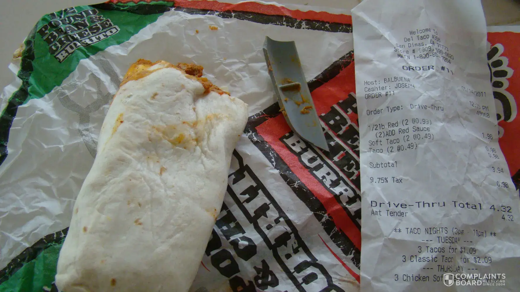we ate at del taco this morning it was a big rip off i orderd the 2 buritos with hash browns for $2 according to your advertizment and what i received was a bunch of crap very very terrible food please get back with me thankyou email gig204@aol.com