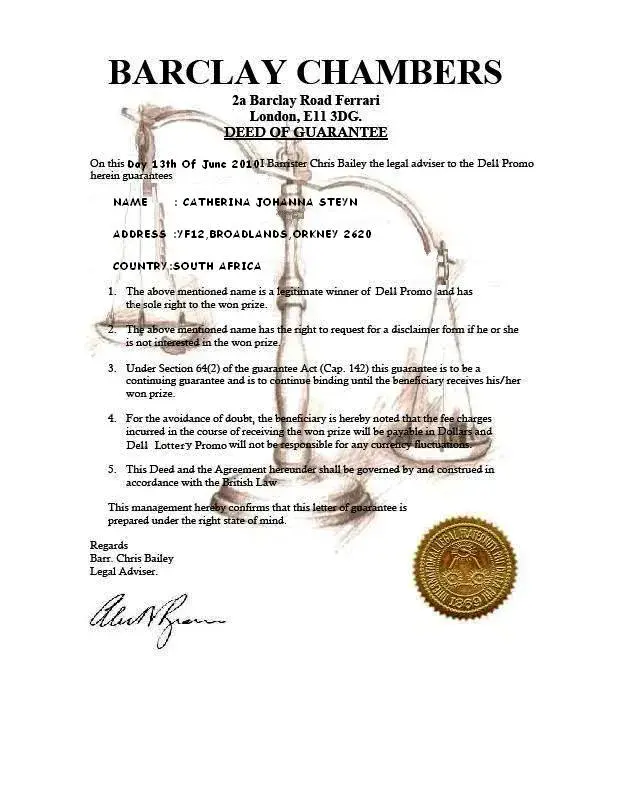 I have also received an certificate to certify that I am a winner from a barrister chris bailey from barclay chambers, 2a barclay road, london, e11 3dg.