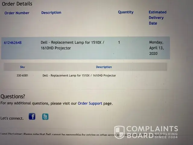 I am writing this to bring to your attention that I am not satisfied above Dell projector lamp and looks like your have sent used Dell replacement lamp hours used 1764 for 1610ND projector bulb.