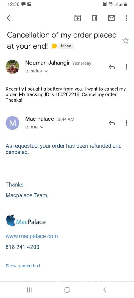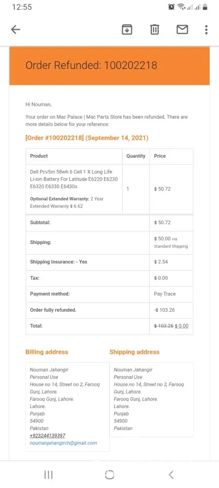 Yesterday at around 11:30am I ordered a battery for my Dell Laptop E6320 without any inquiry about them. After a ment I thought that they can be scammers so I emailed them and requested them to cancel my order and return my money. At night after 12 hours they deducted $103.83 from my card and after 10 minutes they told me that my order has been canceled on my request and that my full payment has been refunded. But till now after the passage of 12 hours I haven't received my money back into my account. Kindly ask them. or do something in order grant my money back to me!