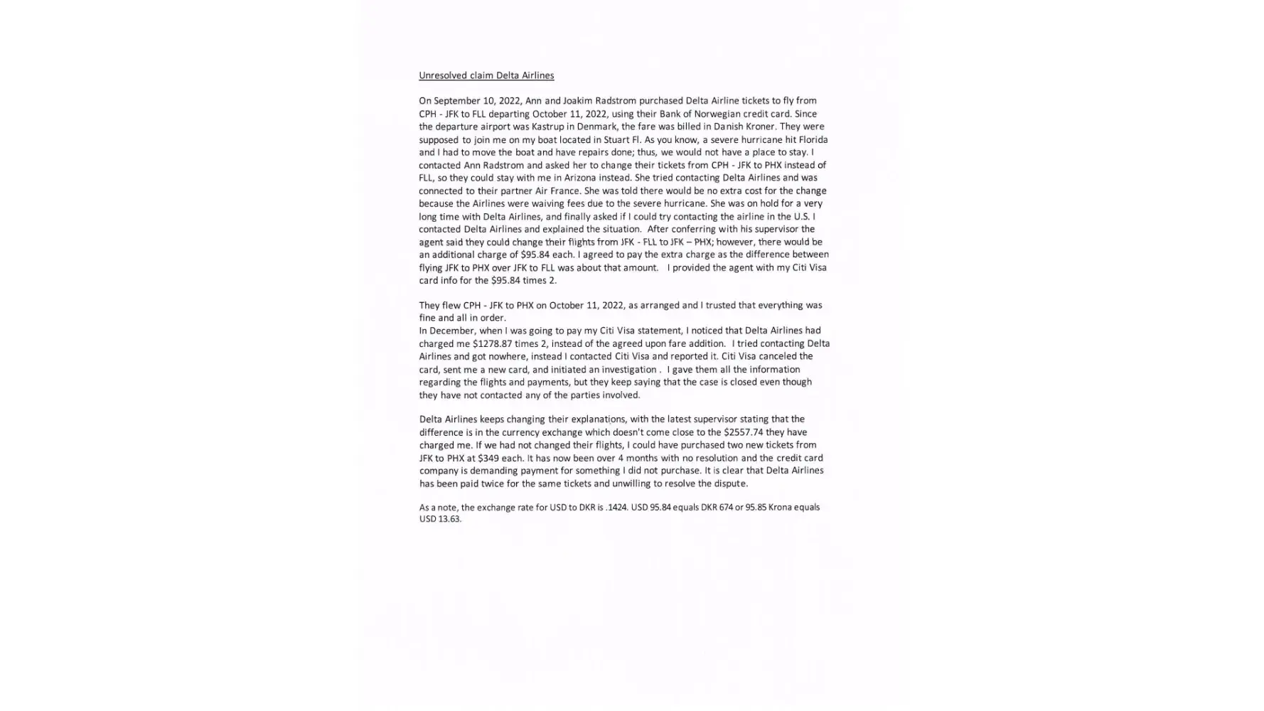 Claimed loss: I would therefore appreciate Delta's cancellation of the unlawful and unilateral $1210.66 charge to my credit card.