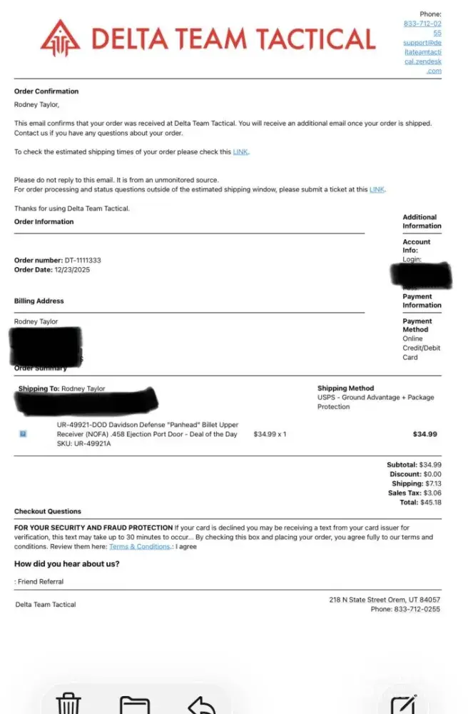 I placed an order on 12/23/25 and have not received any word on shipping or processing. I have called and left messages on 1/5@4:56 central, 1/6@11:29 central, 1/7@17:30 central, 1/9@ 3:54 & 3:59 central. I have also sent an email on1/7@ 17:33 central. No response, none, zero. I can’t reach anyone from Delta Team Tactical. I’ve ordered before and alway...