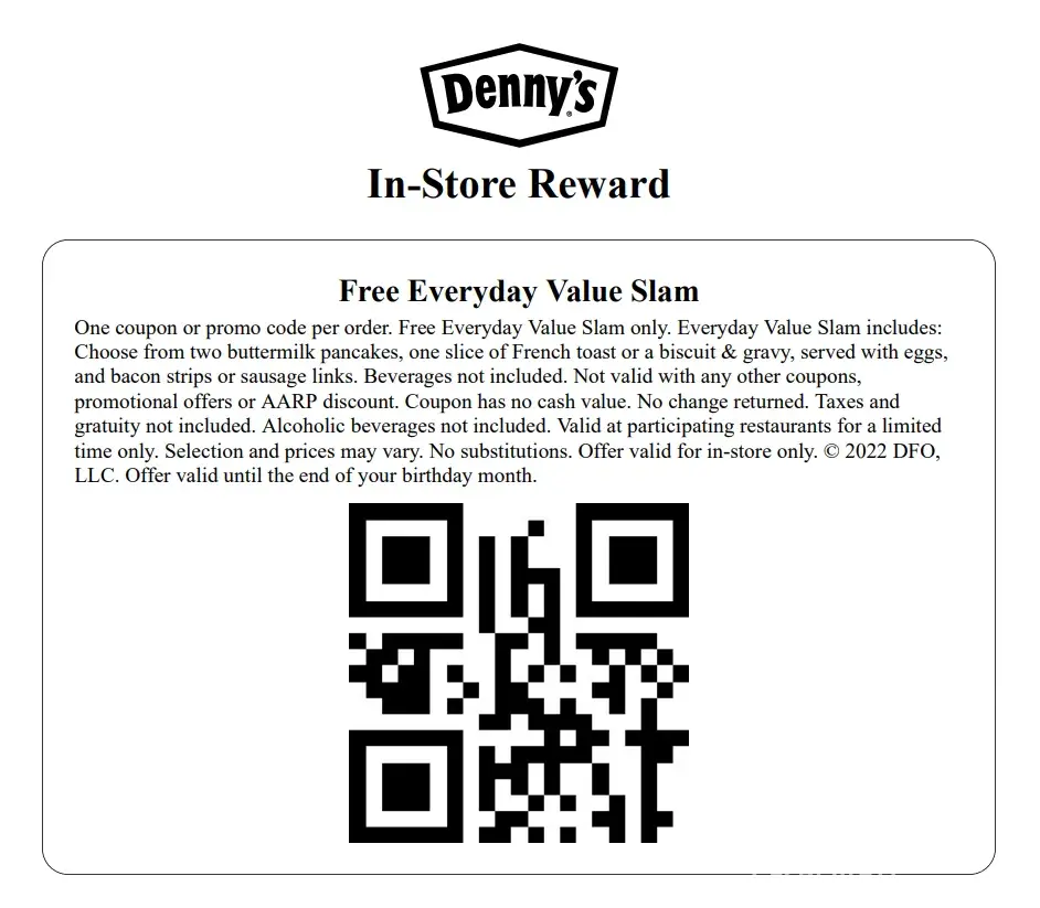 We had a problem today with the Free Everyday Slam Birthday offer. I printed the coupon from the website, because we do not have the Denny's App on a cellphone. The manager told us that the QR Code had expired and charged us full price. The printed coupon states: Offer valid until the end of your birthday month. Can we get a refund for another Denny's meal?...