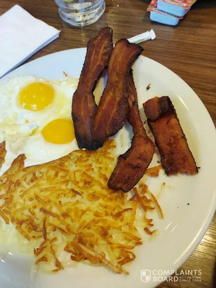 I went to your Denny's located in Kingwood, Tx. First, I would like to say you server took very good care of my family. I ordered a bacon grand slam. Sent back the 1st plate due to the bacon being extremely overcooked and charred. The manager brought back my plate with bacon and said he replaced the bacon. To my suprise it was still overcooked and charred...