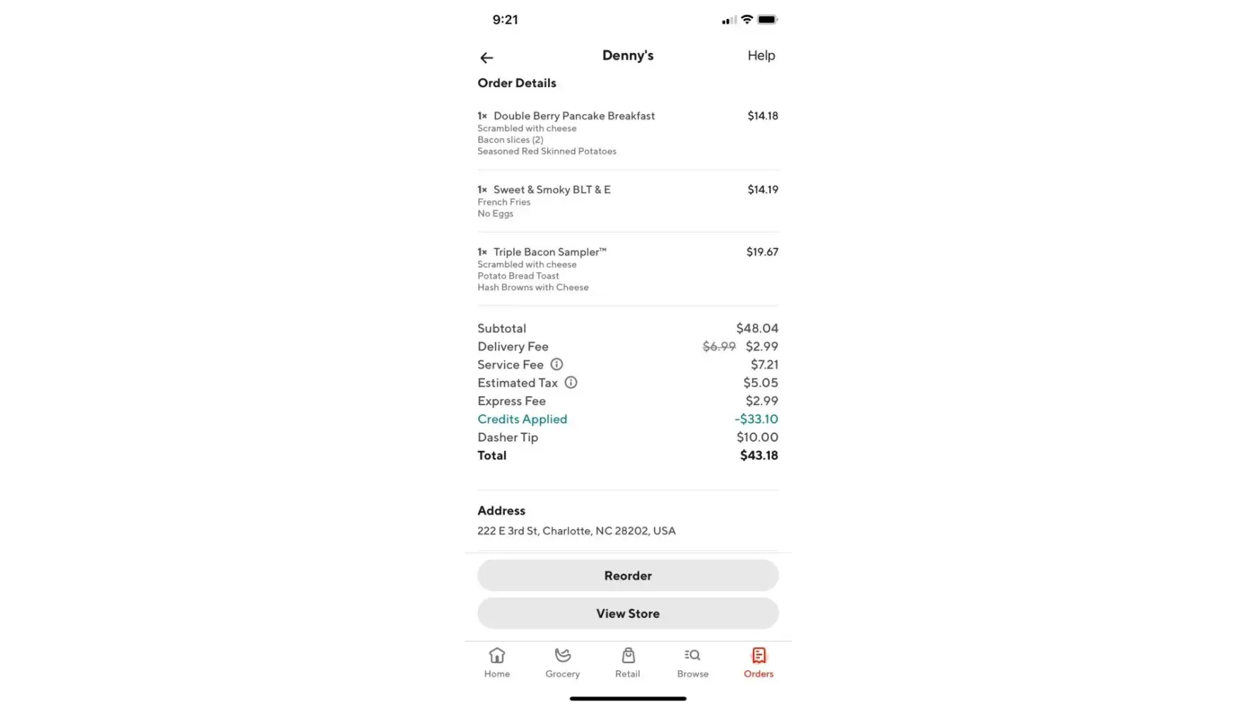 I ordered online through Door Dash at a Charlotte location (receipt attached). I was expecting it to be a delay due to the Beyonce' concert, so the original 60 minute estimated time was not a problem. Our driver kept in communication with us informing us that she was waiting for one more order to be complete. Over TWO hours later, our food arrived and the...