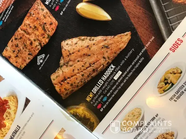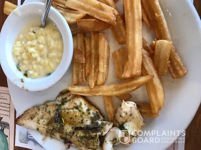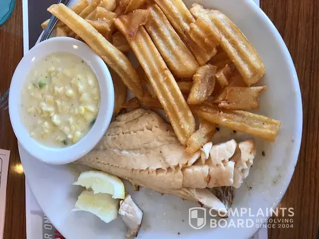 I ordered the grilled Haddock picture from menu included. What I got was plain piece of fish. When I questioned the waitress she took my plate came back maybe 30 seconds later with the next photo, some cold oily spices dumped on top 1/2 my french fries gone and a spoon in the corn. The spoon was laying on the side of the plate when she took it. It was so...