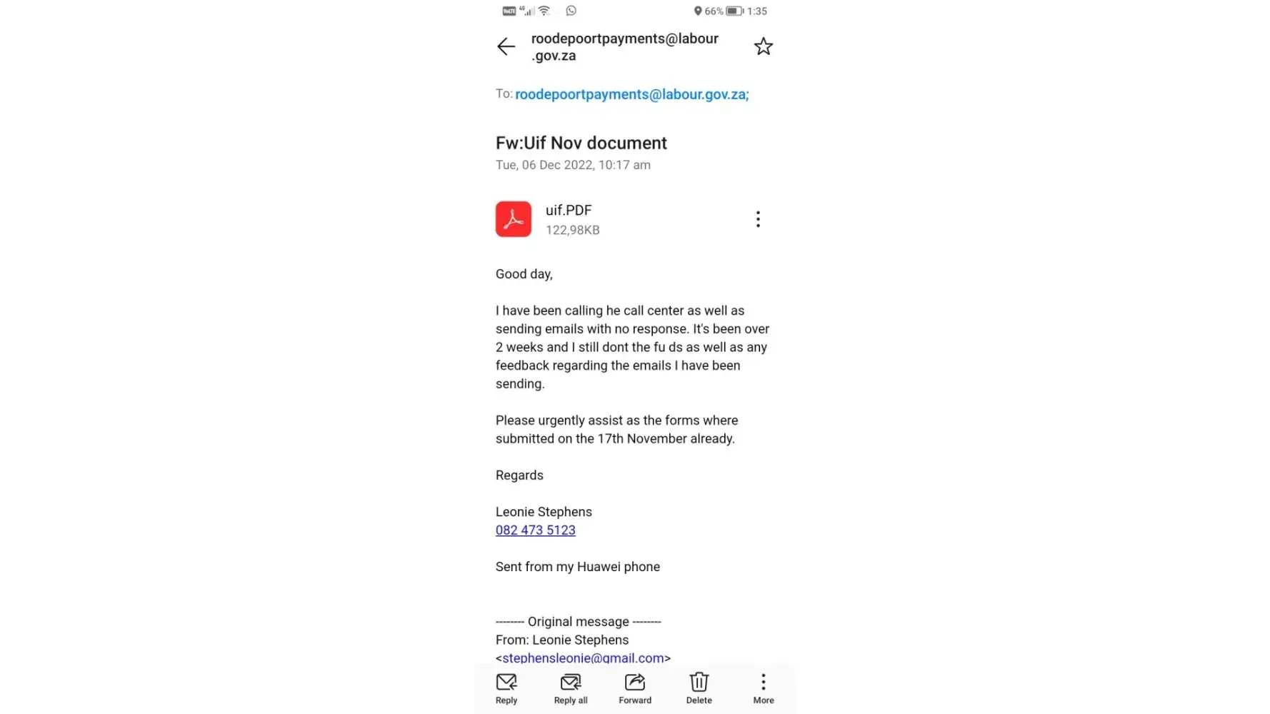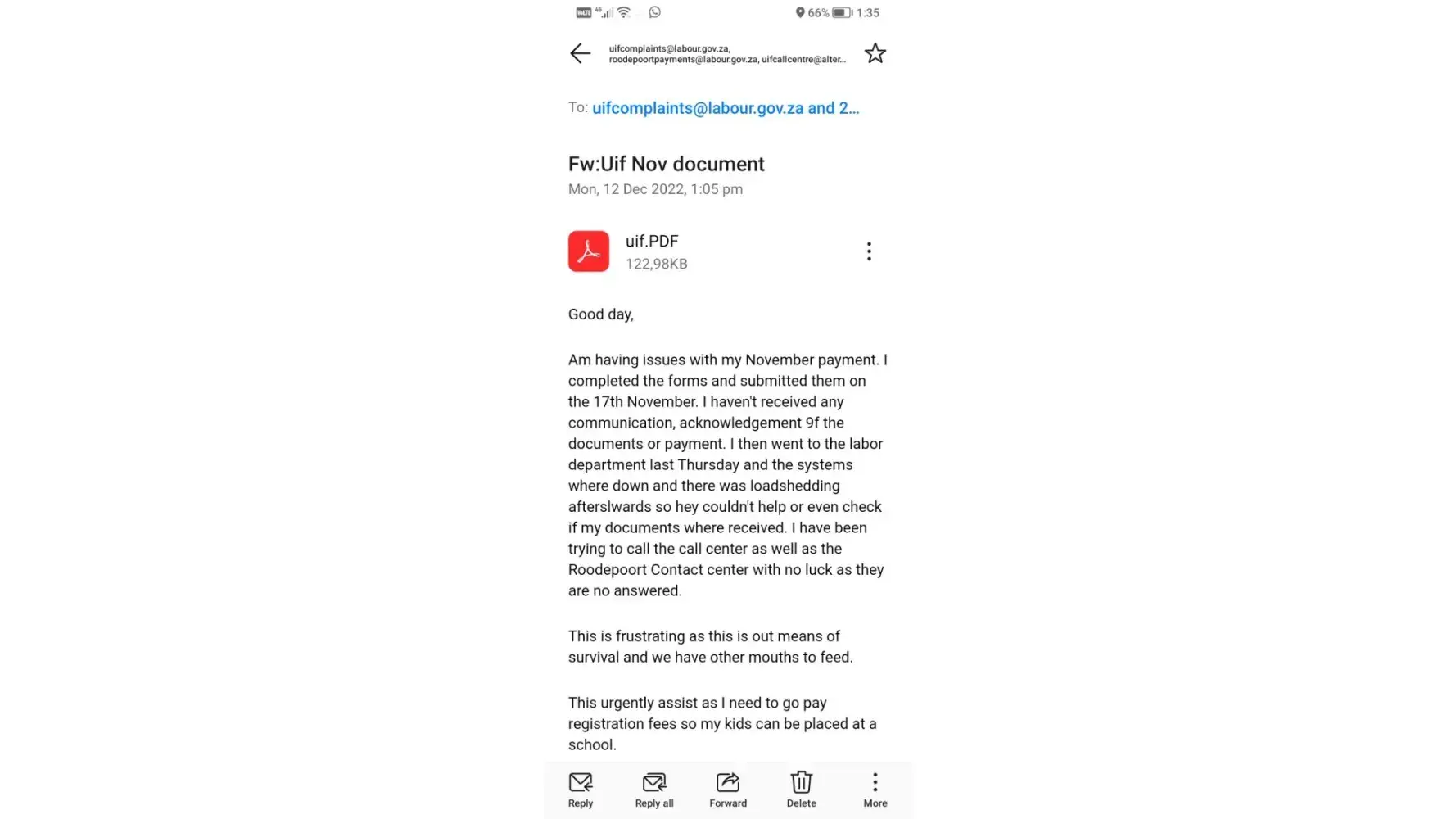 It’s been over a month that I have been waiting for my funds to get through. I called, emailed, even went to the labor office, however they were offline, then it was loadshedding and they said they don't have a generator. This is my last resort and I hope that something will be done cause this money is my means to live for me and alot of other people. It's unfair that we adhere to their process and they are not bothered to even communicate should there be any issues from their side. Emails and calls aren't answered. This is frustrating and unfair to the public as a whole. No responses even to my emails sent to complain about this.