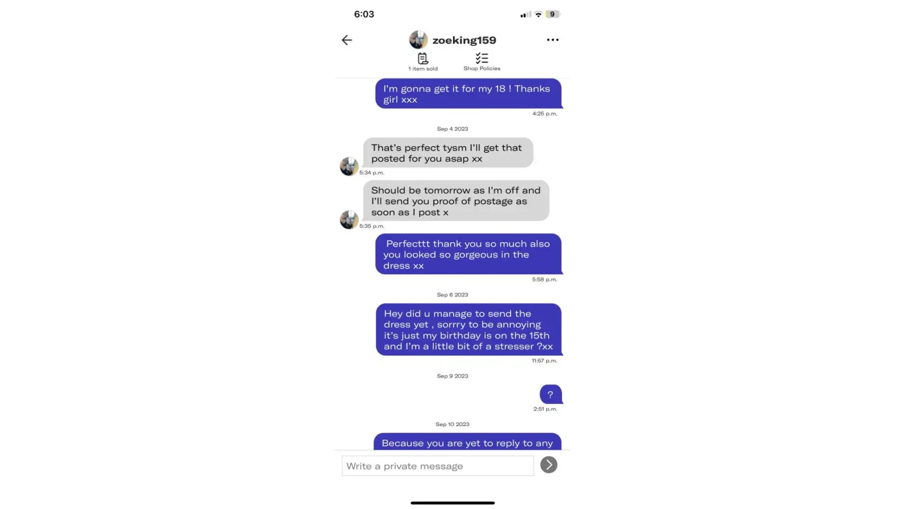 and postage details the day prior i asked if she would ship it that week and she said that would be fine. from the fourth to the sixth there was no proof of postage or any communication for that matter, so i sent a follow up, and i gave her the benefit of the doubt maybe she was busy, her depop said she was active that day, so i send one last follow up on the tenth saying i would be requesting a refund off depop seen as she couldnt even respond to my tests when she is clearly active even today, she took the 60 euros and has not even sent the dress , my username is @laura35679960, i have not got a refund or seen my item. sorry about this i have had no problems with depop till now and her account seemed genuine