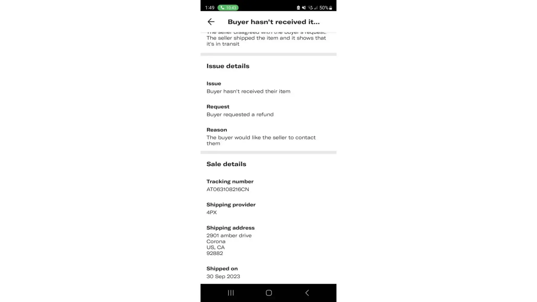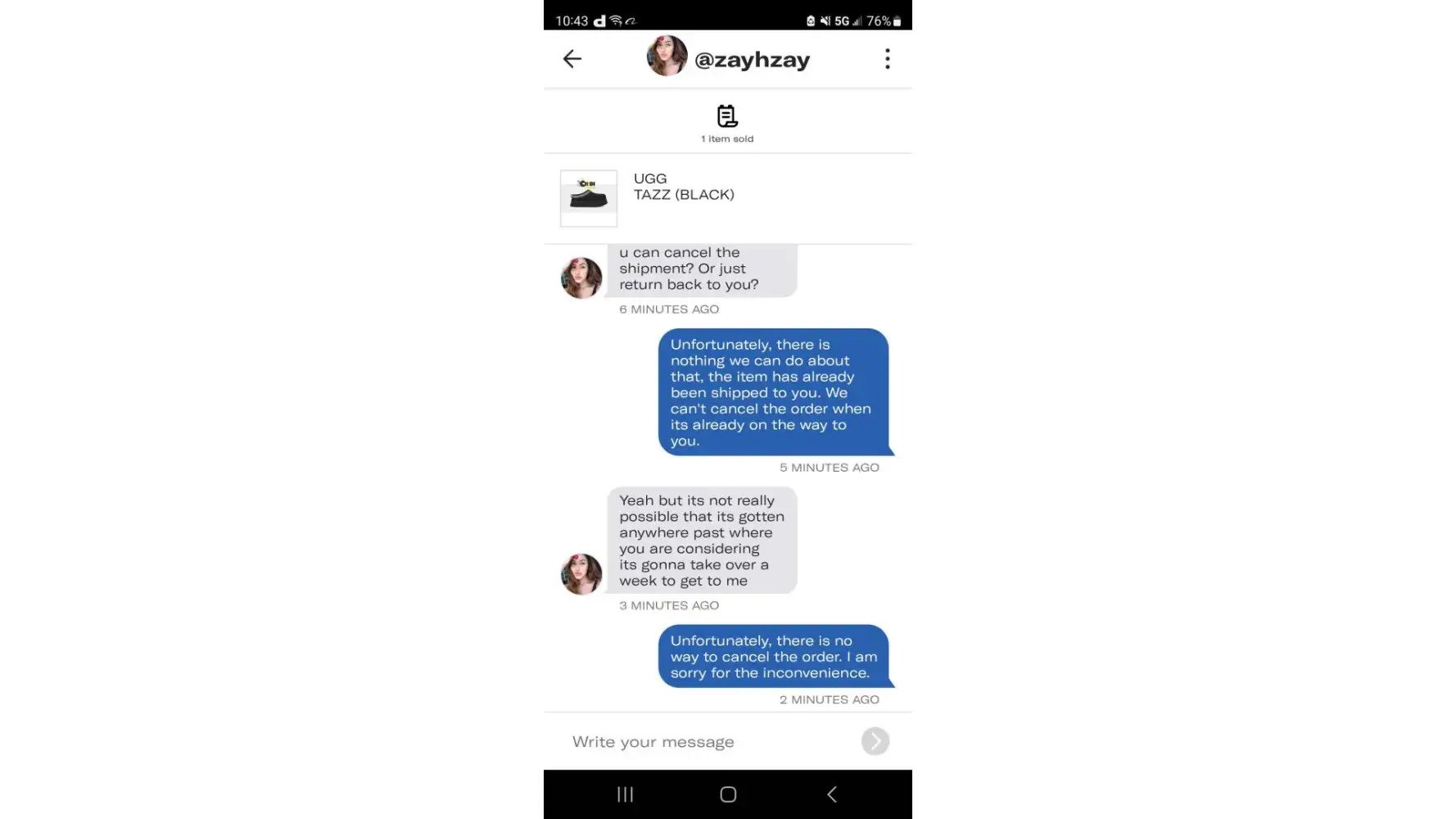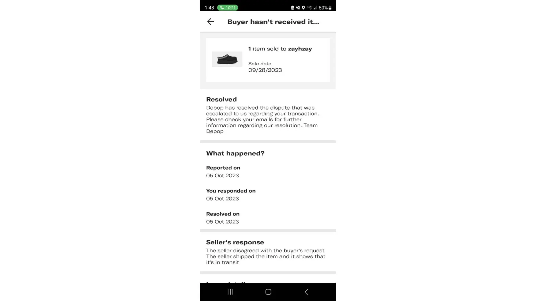 A Buyer, Zai Zayster reached out to me on the sale of an item called the UGG TAZZ Black. I shipped the item to the buyer. It takes 3-5 business days to ship items to customers, and it may take 7-14 business days for the item to arrive. We made an exception for the buyer, and shipped the item within 2-3 days. This was all communicated to the buyer. The buyer agreed to this 9/30/2023. Today, 10/5/2023, the buyer inquired about the item, and if it will be delivered by 10/12/2023. We explained to the buyer that it may not be possible since it may take 7-14 business days (excluding weekends) to deliver. The buyer A Buyer, Zai Zayster reached out to me on the sale of an item called the UGG TAZZ Black. I shipped the item to the buyer. It takes 3-5 business days to ship items to customers, and it may take 7-14 business days for the item to arrive. We made an exception for the buyer, and shipped the item within 2-3 days. This was all communicated to the buyer. The buyer agreed to this 9/30/2023. Today, 10/5/2023, the buyer inquired about the item, and if it will be delivered by 10/12/2023. We explained to the buyer that it may not be possible since it may take 7-14 business days (excluding weekends) to deliver. The buyer then wanted to cancel the order, which is impossible since the order has been shipped and is in transit (Tracking Number AT063108216CN). The buyer then creates a dispute with Depop under "ITEM NOT RECEIVED). I respond to the case immediately saying I disagree with the case, and that the item is in transit, and the tracking number is already uploaded on Depop for both the buyer and Depop to see. The case was escalated quickly and resolved within minutes, in which the buyer was refunded from my account. The buyer @zayhzay now gets to keep both the item and the money, which is a scam. I told Depop about this fact, and that I provided all tracking information and told the buyer about the shipping time, but then a Depop Rep named Wrench, said that I have to go and ask the buyer for the money back or a return on the item when it arrives to them. That means they know the buyer will receive the item. I then asked the buyer for the item back when it arrives, but they are no longer responding. This means they know they have scammed me, and now want to dodge accountability. Prior to this, I had a similar case, in which the case was decided in my favor. And I was told in an email (picture uploaded) by a Depop Rep named Dolores G, that as long as I upload trackable information, Depop will close disputes in my favor. All I want is my money back and an apology from Depop.
