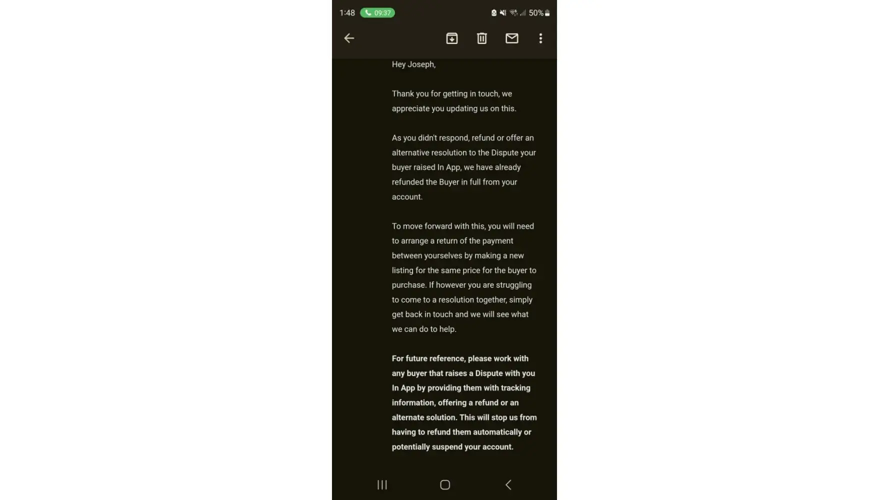 Then, once a week had passed and Depop was still withholding my balance, I contacted customer support. I got 2 vague emails, 1 claiming I had a negative balance from a refund (I have not issued any refunds recently) & 1 claiming I had ‘insufficient funds’ and it was a ‘bank issue’. These responses seemed to have been copied and pasted with a tiny bit of modification (I.e. a telltale sign was the latter email containing the phrase ‘due to your bank account had insufficient funds’). I contacted my bank on Monday 17th April and they let me know that there had been no attempt for depop to pay anything in, and they can not decline an incoming payment due to a bank account having ‘insufficient funds’.
