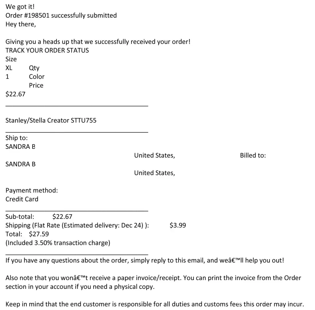 I placed an order for a t-shirt for my husband on 11/30/21 and received a confirmation and then a message on 12/1 that my order was complete and shipped! It was supposed to arrive before the holiday but no product and no response. I've been going around and around with their customer service and it sounds like the order was never done, although my credit card was charged on 12/1/21. Still no refund and Customer Service is just a loop of no information just a message that they made a technical error when they said my order was complete, but have not and I assume, will not process a refund. No product to be had for my payment, just terrible customer service.