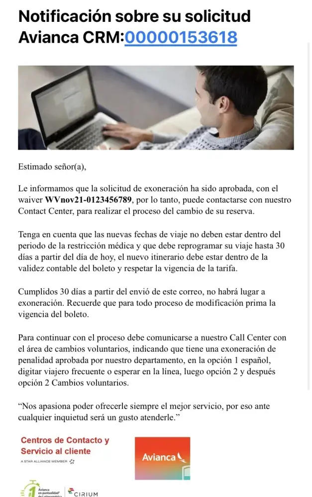 La ruta Miami - Gye, fue reportada por afectación de covid-19 para ser gestionada a través del sitio oficial MIS VIAJES DE DESPEGAR. Mencionada solicitud de exoneración fue aprobada por AVIANCA con el waiver WVnov21-[protected], sin embargo DESPEGAR no me permite hasta el momento realizar las opciones de cambio de vuelo. Una opción para el 07 de enero que ACEPTE y coloque los datos de la tarjeta para pagar, fue cancelada por ellos mismos.. Por varias ocasiones he llamado al Call center de DESPEGAR y me indican que ellos no pueden darme solución, y AVIANCA me indica que debo realizar el trámite a través de despegar