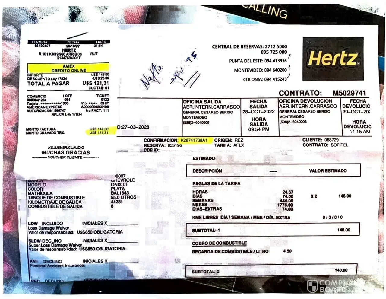 When I attempted to pick up the vehicle on October 28th at the Hertz counter In the Gral. Cesareo Berisso S N Montevideo, Uruguay (International Carrasco Airport) I was told that the reservation was not showing up as paid and I had to pay them an extra $148 with an Amex ending in 1005. I was given another receipt with the same lease-out number: K28741738A1. This second receipt is also attached here.