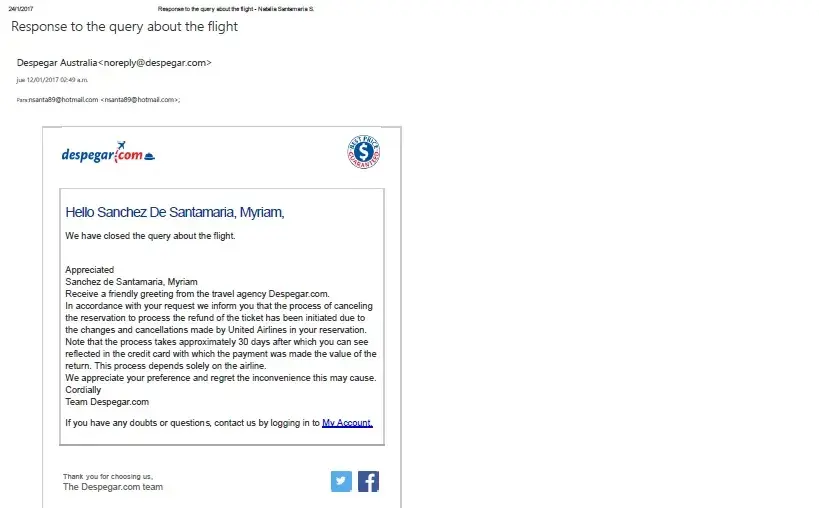 we have less than a month to solve the problem (Ticket departure 22nd of February 2017), and Despegar is playing with us saying that they are going to make the refund and then taking it back.