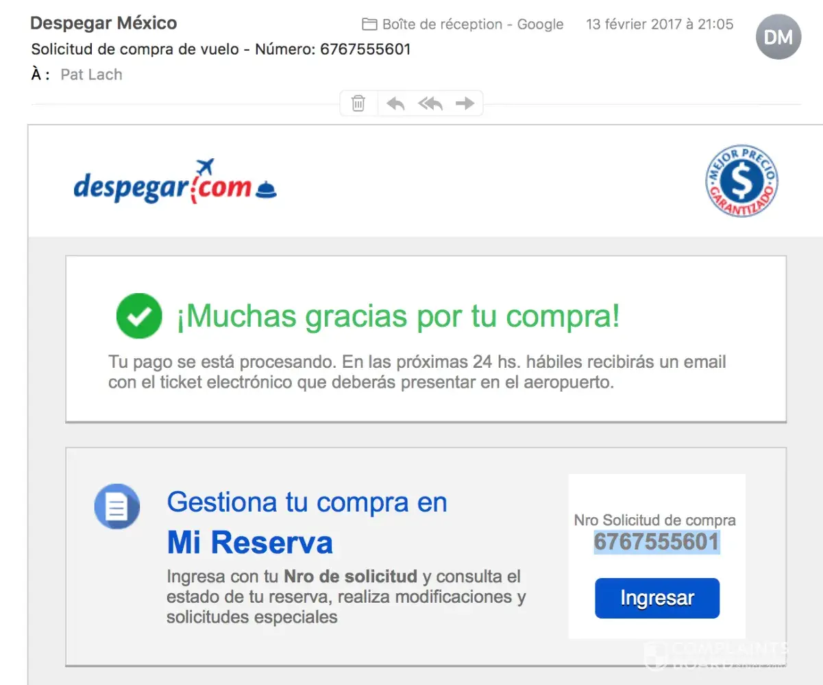 could you please search in your first e-mail sent from despegar.com the numeric reference (Example: [protected] )