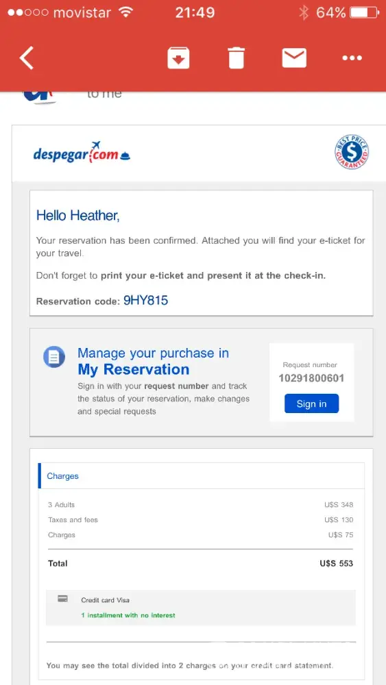 OMG. It was the worst deal. I booked the flight and hotel through the company www.despegar.com. Basically, they did only one thing. They charged me for the hotel and flight. But now they didn’t send any information about the flight details. I got only email about the hotel, but it was also useless. I think that they have scammed me, but I have no proof. Please, need some advice.
