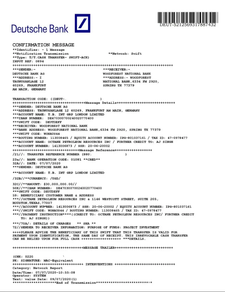 money was stolen from my account and sent to woodforest account. ($30, 000, 000) my account is : t.b. int grp london limited, deutsche bank ag. iban number : dd470300700240020770400, swift : deutdeff, address : taunusanlage 12 60269, the receiver account : woodforest national bank. this is address: woodforest national bank, 6334 fm 2920, spring tx 77379, account number [protected], account name octane petroleum resources inc, inc swift : wonaus44