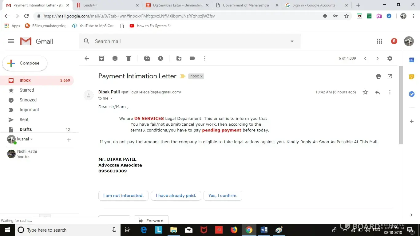 . Sir a company Named DG SERVICES that is from Latur Maharastra is a form filling company and helpline email ID : ff.helpline@gmail.com and helpline contact no [protected]. One of their Employee once call me and said offering you a form filling job sent me a adder proof document and I sent him and then they made a agreement on a non Judiciary stamp of my name as second party and their own as second party. Then they sent me a user id or password and sent me a website link named workfromhomes.in with their conditions, and they assigned me 1500 forms for form filling work 10 days time, which completed within 7 days itself due to my typing speed of 50 wpm and with 98% accuracy, so I know my capability and accuracy of my job, but when I completed and submitted my work on 7th day date next day itself I got replied that your qc result are now in website when I went and checked with website I found its mentioned qc results failed, but the data which I typed and which they sent in qc results both differs and showing more errors .now they are demanding money within nest day of submission of there qc result and continuously calling, SMS to pay money and when I googled and search the details regarding this company I found lot of people already filed complaint against the above mentioned company, after that a advocate of them contact me and demand money from me . And threatened me that if I don’t give money to them then they will file a case against me . I got a mail dated on 28 /08/2018 stating we legal department DG services hereby having your case for QC Fail of work by the advocate named AJAY GOEL, Surat, Gujarat, contact no: [protected]. And threatened me that make payment of RS. 8620, provide the screenshot of successful payment on this email ID associationadvocate.legaldepart@gmail.com. On the basis of that they will provide me NOC letter and threatened me that If payment is not done then need to pay Rs. 50000 for total loss to his client. It also another advocate named M. PATEL, contact no: [protected] send me a legal notice by an email ID associateadvocate08@gmail.com on 31/08/2018 and demand money within 4 days Rs .4900 + Rs. 2500, Sir I am a student, It is not possible to give money to me. Please help me sir.