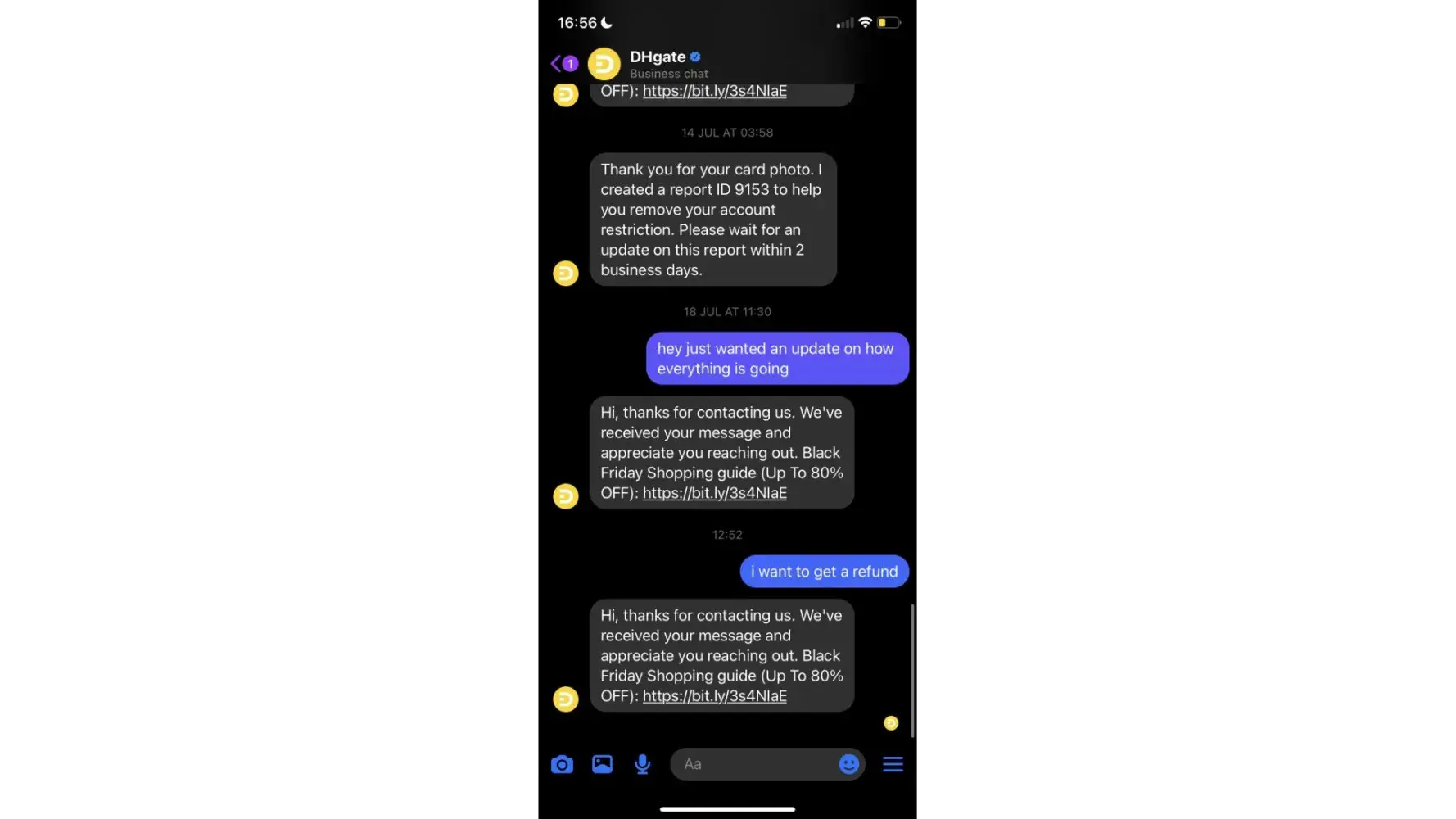 Hi, I have contacted CS agent many times they are useless and don't know what they are doing same with the safety team, my account is under restriction I am unable to receive any messages in my inbox on my DHgate account all stopped since 25th September. I have spent many hours with CS agent trying to find out what's the issue. then I was told to contact safety them to remove restriction on my account because all messages are hidden on my account but CS agent can see the messages on his side but its not showing on my side. I have emailed many times to Safety team but they keep asking what's my order number when I have told them I the restriction removed from my account but they say no restriction on my account.
