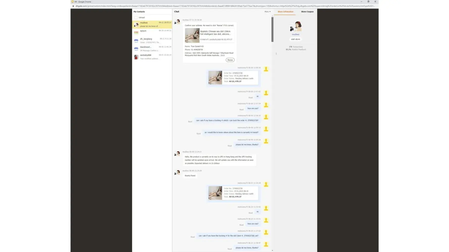 I would like to open a dispute case in regards to the order #, [protected] (Realistic Chinese sex doll 158cm full intelligent Sex doll, silicone solid buttocks and legs real sex sound, automatic heating vagina high quality) as I have not receive this item to this date (4/10/2023).