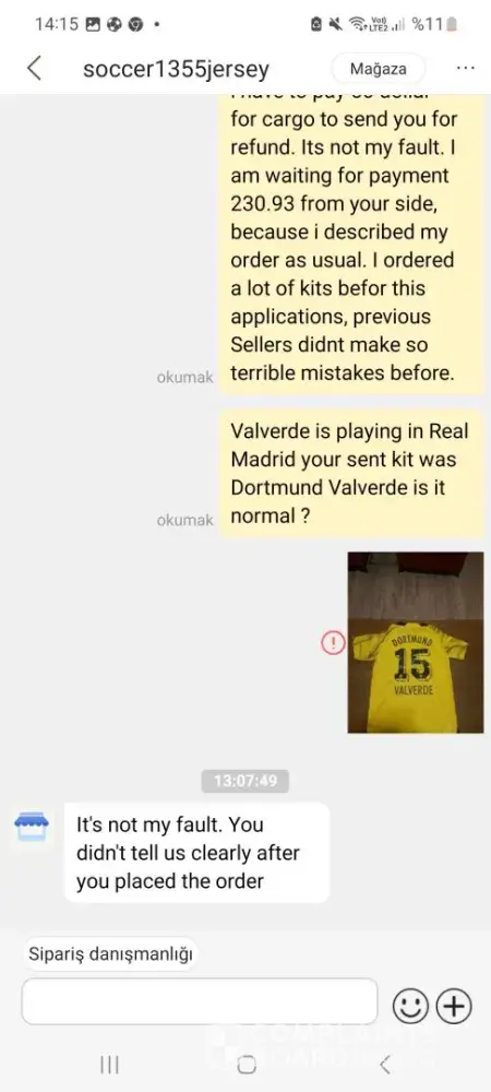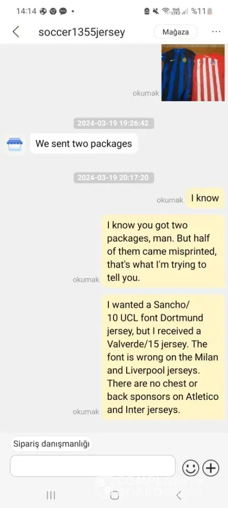 Good day. My last order on DHgate was the worst experience i have ever had. I ordered the 10 jersey. When i opened the cargo the items were wrong. For example I wanted a Sancho/10 UCL font Dortmund jersey, but I received a Valverde/15 jersey. The font is wrong on the Milan and Liverpool jerseys. There are no chest or back sponsors on Atletico and Inter jerseys. I messaged to Seller, then wrote to DHgate team, they agreed to pay only 174 dollar. I spent 163.93 dollar for kits, 17 dollar for customs fee, 50 dollar for shipping to resend the Seller for refund. My loss is 57 dollar. I dont lose only money i lose the time. The shipping process lasts 2 weeks. I cannot sell wrong items to customer nobody buys "Dortmund Valverde" because Valverde playing in Real Madrid. Two pieces smelled plastic. The Seller rejects to pay me my money, blaiming me to unclear order . His shop window was right ordered accordingly his shop window, but after manufacture process was almost wrong. I have to send the items today pre paid 50 dollar for cargo. The Seller messaged " This has nothing to do with us, because you did not give us a clear account of the tariff in your previous order. Our company will apply for a subsidy of $8 to you at most" My loss is 57 dollar he get me know about subsidy only 8 dollar. By the way, the Sellers store is closed now, it shows him like unfair Seller.