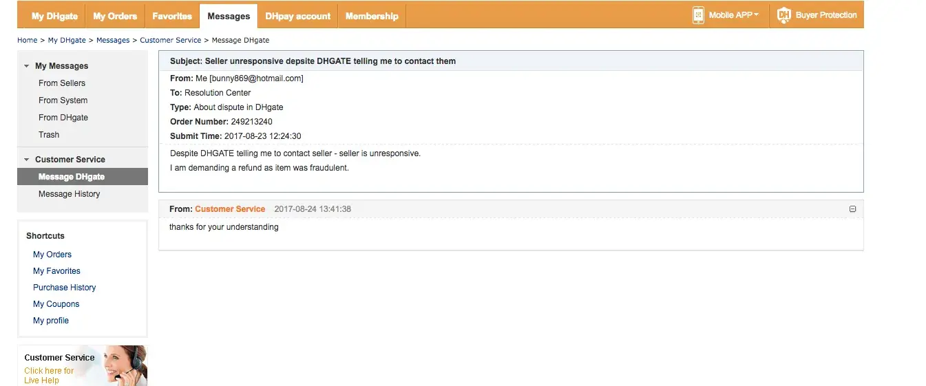 Messaging DHAGTE through their website simply gets "we are sorry for your bad experience with DHGATE".
