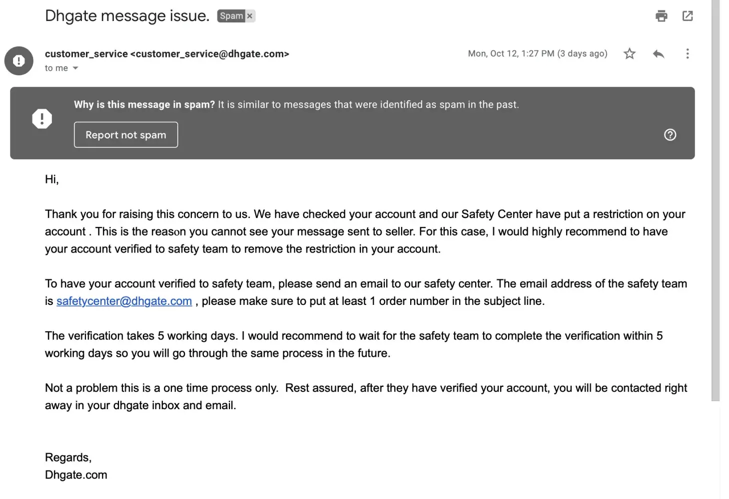 Hi, I have contacted CS agent many times they are useless and don't know what they are doing same with the safety team, my account is under restriction I am unable to receive any messages in my inbox on my DHgate account all stopped since 25th September. I have spent many hours with CS agent trying to find out what's the issue. then I was told to contact safety them to remove restriction on my account because all messages are hidden on my account but CS agent can see the messages on his side but its not showing on my side. I have emailed many times to Safety team but they keep asking what's my order number when I have told them I the restriction removed from my account but they say no restriction on my account.