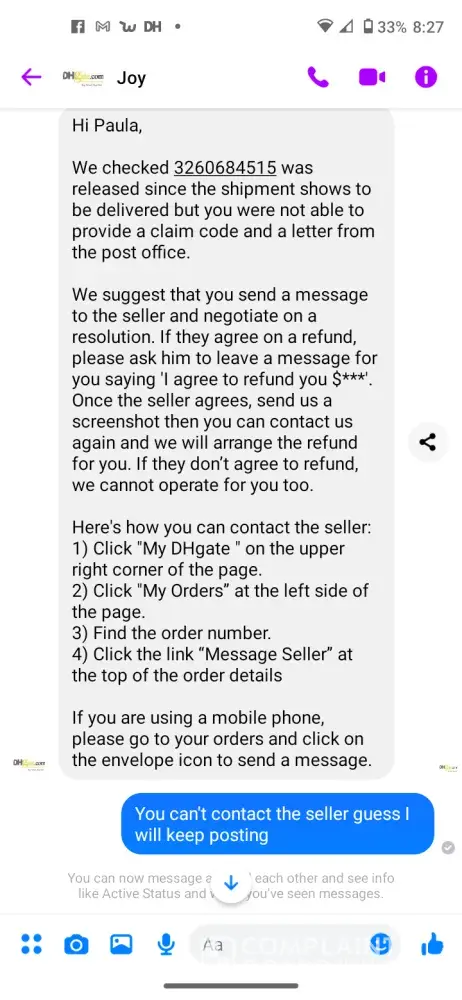I need help to get this resolved and a full refund. Dhgate reference is [protected]