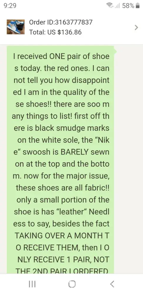 I placed 4 orders on 11/21/2019. The order consisted of 2 pairs of shoes, a hoodie, tshirt and 2 cell phone cases. First off it took over 3 weeks on 2 of the orders to FINALLY depart China. I received the 1st order and the cases were all scuffed up, different color wrist straps, 2nd order: the item was 2 sizes too small &looked like a THICK vinyl iron on design was placed on it. 3rd order: received 22 days after purchase date. They were to be 2 pairs of shoes, I only received 1 pair. They had black smudge on them, where the top was to be leather, it was foam. Point of this is HORRIBLE product quality. (4th order:still in China. Today is 12/26/2019) I have messaged sellers, no responses, I have used the dhgate dispute option. First off after all the time that has passed on waiting on the items to ship, you have to wait 10 BUSINESS days for the mediation resolution. The deadline was 12/17/2019 for their resolution. As of today, once again 12/26, no resolution after their deadline and no response from messages sent. I paid over $300 for all orders(which were all going to be Christmas gifts) So at this point I am out $300, cannot get refunds or messages back from their resolution department.