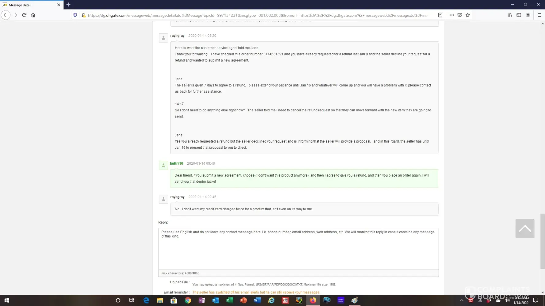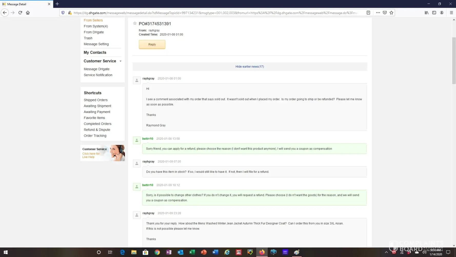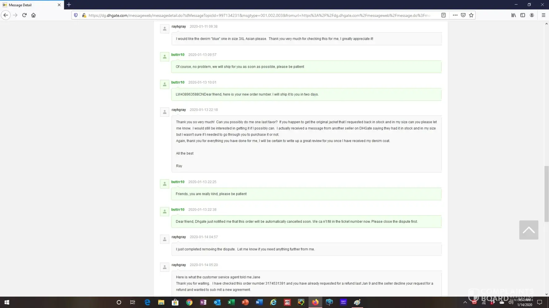 I then messaged the seller and they informed me that I should file for a refund which I did. (see attachments entitled message history re bomber jacket).