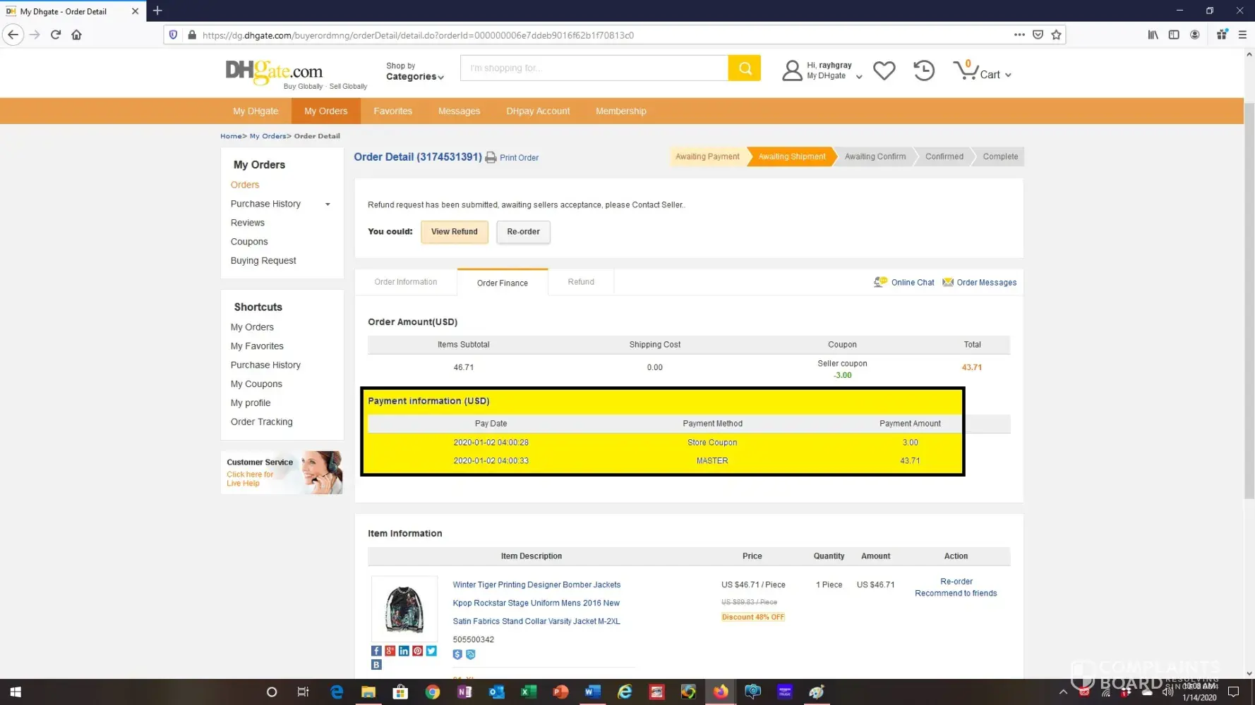 I placed an order for a bomber jacket thru dhgate.com on 01/02/20 for the total amount of $ 46.71. On 01/08/20 I was checking the shipment status of my order and saw a message associated with my order that says "sold out" (see attachment 1 entitled order detail with comments) which clearly shows the item is in stock in china and available. You can still place an order for it however if it is not in stock I don't understand why they would still be taking orders and money for it.